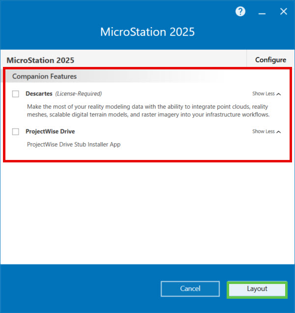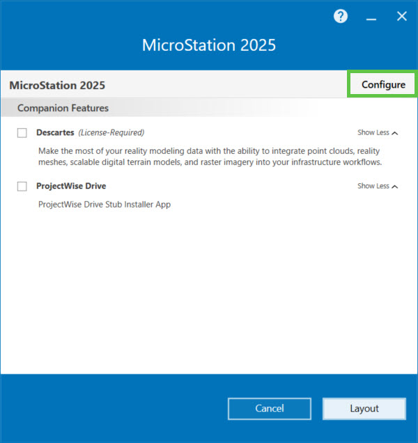- The MicroStation Installation Wizard opens. (Optional) Click MicroStation CONNECT Edition > Configure to change the installation options.