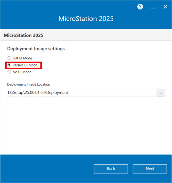 The deployment settings are displayed when you run the setup in/layout mode. Following deployment image settings are displayed in the MicroStation Installation Wizard.