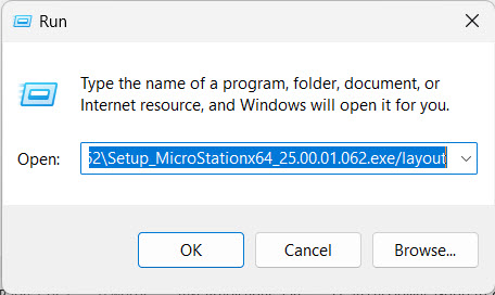 - In the command line, go to the folder that contains the MicroStation setup executable and run the executable with the /layout command.