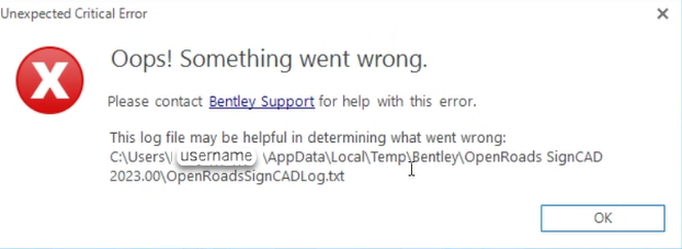 5) If you receive an "Unexpected Critical Error" when launching OpenRoads SignCAD, please create a case and upload the OpenRoadsSignCADLog.txt file and Event Viewer logs for review.