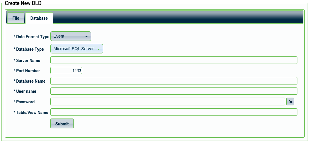 The second tab on the creation panel is for creating a DLD based on a database view or table. The settings on this panel are:
