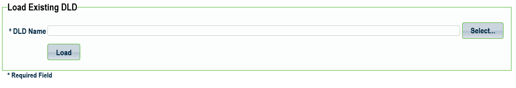 At the top of the Load Data page there is a section for loading an existing DLD in order to modify it or to use it to load a data file. Pressing the "Select" button will show a pop-up dialog containing a list of all the DLDs that are currently in the database, and selecting one from that dialog will populate the "DLD Name" field. You can then press "Load" to load the DLD into the page for editing or for use.