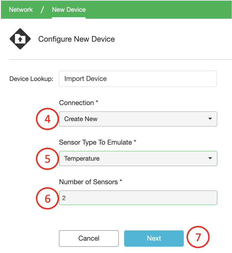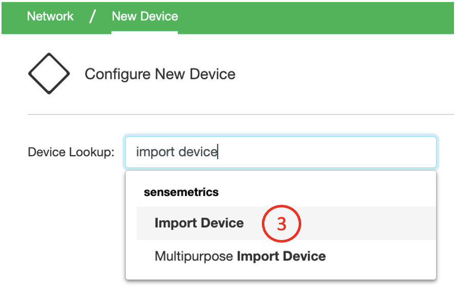 4. Select which Import Device you would like to add additional import sensors to on the project. If a new device is required for import, choose "Create New" to make a new virtual device connection if one already hasn't been made. The dropdown will also allow the user to select any previously created import device.