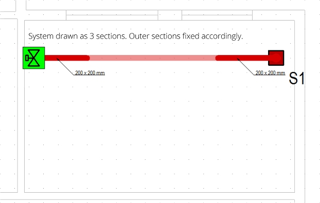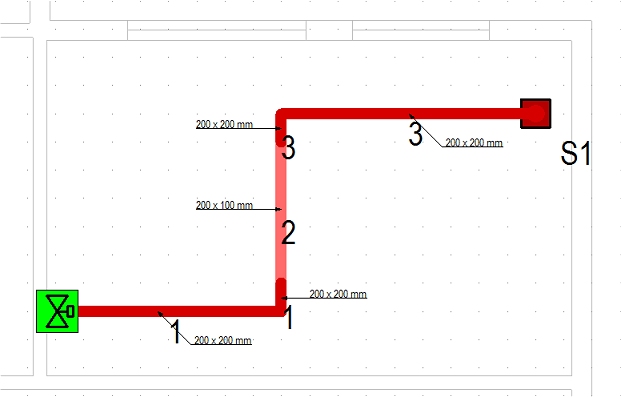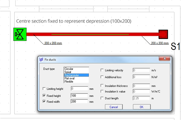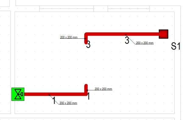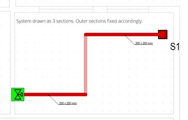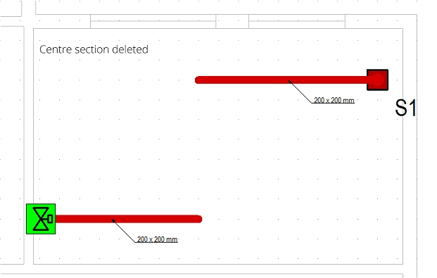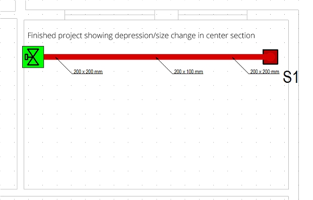 As above, the centre section of this short run will be fixed to emulate a 100mm depression in duct sections. This is slightly more involved than the straight run as duct (and pipe) sections drawn around a bend usually heal into the attached sections, making them all one piece. Under these circumstances, providing different fixes to the same duct section would result in the whole of the section being fixed to the tightest constraints. To overcome this you need to consider using stub sections to allow the fixes in a way that would have the smallest effect on the system.
