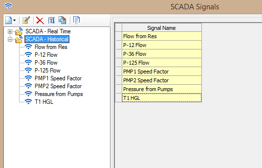 The next step would be to link the SCADA data to the SCADA Elements in the model. You can do this in SCADAConnect Simulator by going to the Configure tab and select the SCADA Signals button. From the main user interface, you can open this by going to Components > SCADA Signals. Either option will open the dialog shown below.
