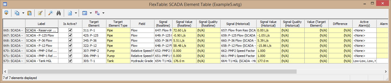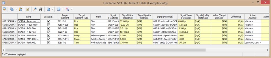 Now that WaterGEMS knows what model elements are associated with the SCADA signals and where tags in the SCADA file are located, the SCADA elements need to be matched with the tags. This can be done element-by-element in the property grid or more quickly by opening the SCADA Element FlexTable.