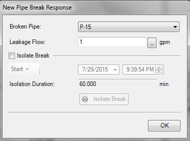 You can set the leakage flow rate and choose the start time to isolate the break by checking the isolate break checkbox. Clicking the checkbox allow you to set the date and the time to run the simulation, as well as input an isolation duration. Enabling the checkbox also enables the “Isolate Break” button, which opens the window shown below.