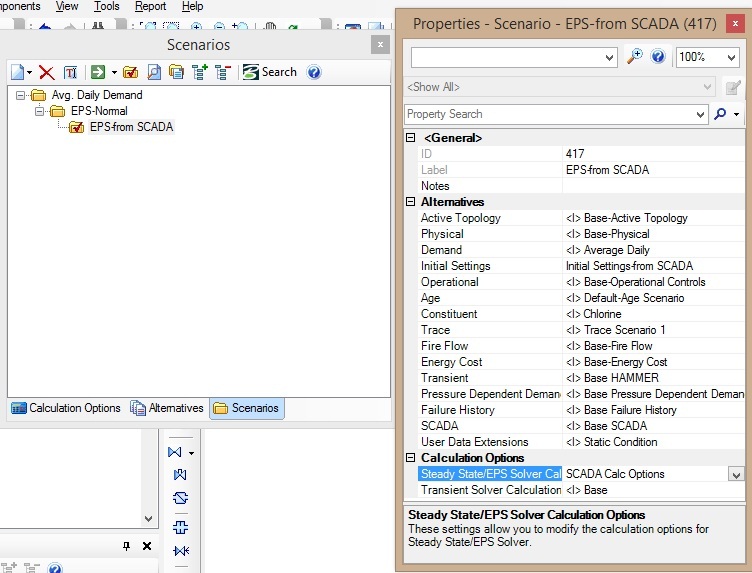 In the screenshot, the starting scenario is "EPS-Normal,” with an initial conditions alternative called “Base-Initial Settings” and a calculation option call “EPS24.” A child scenario was created called “EPS-from SCADA.” This new scenario uses a new child alternative called “Initial Settings-from SCADA” and a new calculation option called “SCADA Calculation Options.” Setting up the SCADA Simulator this way would enable the user to try a wide variety of adjustments without changing the settings for the starting scenario. This setup of a new scenario and alternative is not necessary, though a new calculation option would be generally be used.