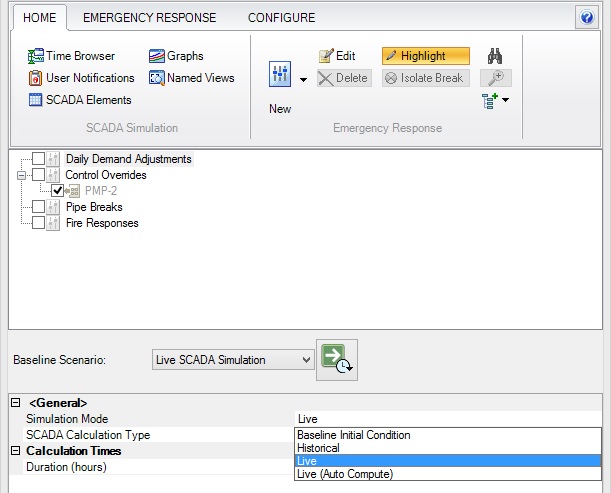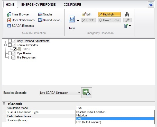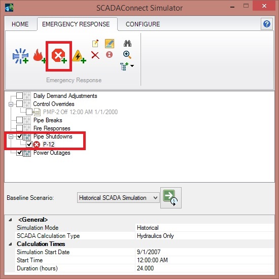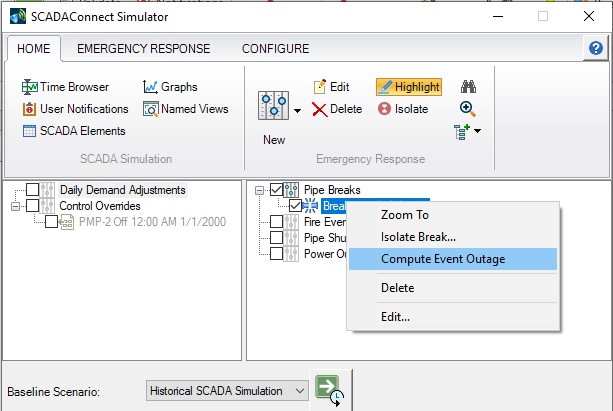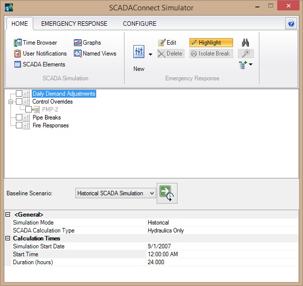 There may be slight differences in earlier release, but the workflow will be the same. In the Home tab, the upper part of the dialog is split into the SCADA Simulation section and an Emergency Response section.