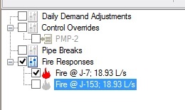In the middle part of the Home tab, you will see any demand adjustments, control overrides, fire responses, or pipe breaks that you include in your run. If you do not want to have these applied when you compute, you would simply uncheck the box beside. Similarly, this tree form allows you to have multiple items, such as two fire responses. You may not want to have both apply for a given run and in such a case, you would uncheck on fire response in the tree form and leave the other checked, similar to what is shown below.