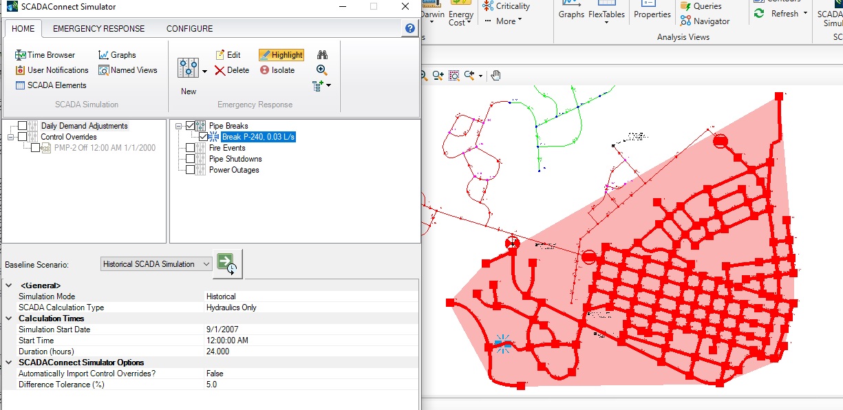 Open SCADAConnect Simulator, if you have not already. With the setup complete, an operator can basically do whatever they need to in order to analyze the system and add SCADA data to the model. This includes new features related to pipe breaks and fire response runs.