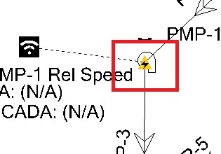 This will allow you to account for an outage during an historical simulation or to plan for an outage in real-time simulations. When the run is computed in SCADAConnect Simulator with a Power Outage applied, the solution will include the results when the pump is not available. You can include multiple power outage events in the simulation. If the event does not need to be included, you can uncheck the box in the Enabled column. When the pump is enabled for a power outage, the symbol below will appear over the pump in the drawing pane.