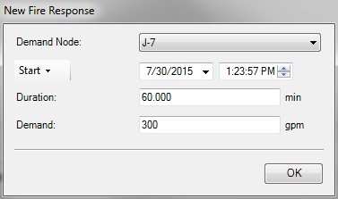The new fire response dialog is similar to the pipe break dialog, except in here you define the demand node and demand that you want applied to that node instead of supplying a leakage flow. After running the fire response you can easily use the time browser button at the top of the home tab along with the graphs button to view how your model responds over time.