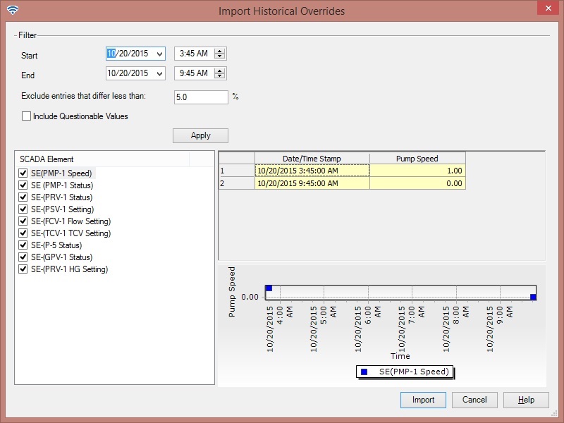 This will open a new dialog that will allow you to import the controls from an existing source file. The SCADA Signals will already need to be set up the correct source to do this. The SCADA Elements will appear in the box in the lower left. The control override can be filtered for a certain time span.