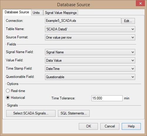 Then continue to fill in the data. What is entered will depend on the data source and the available data. The data from Example5.wtg can offer some guidance, since this uses an Excel file for the data. Table Name is the data table that contains the SCADA data. Source Format can vary depending on the source. For many database sources, there is one value per row, so that option would often be selected. Signal Name Field is the column in the data source that contains the 'Tag' or 'Signal' name. Value Field is the column that contains the SCADA value. Time Stamp Field contains the FULL date and time. Questionable Field is not supported by all SCADA systems. You can leave this as the default if you are unsure. Lastly, you would choose whether the data is real-time or historical. Database source are typically historical sources. Next, choose the Select SCADA Signals button. You will see the dialog below: