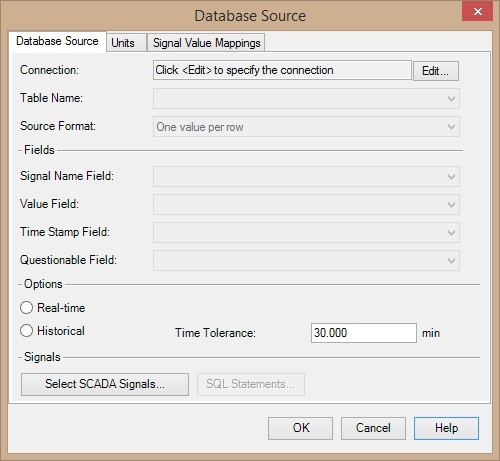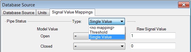 SCADA signal values can be mapped to a raw signal value in the Database Source dialog. This takes into consideration that SCADA signal values may have varying formats and provides additional flexibility to transform these values into a form the software can interpret. This new feature can be accessed in SCADAConnect Simulator by going to the Configure and choose SCADA Signals, or my going to the Components pulldown menu from the main interfact and selecting SCADA Signals. Available options for the status types are <no mapping>, Threshold, and Single Value. The Threshold type allows the use of operators =,!=, <, <=, >, >=, and <none>. When the Single Value type is selected, only = and <none> are available.