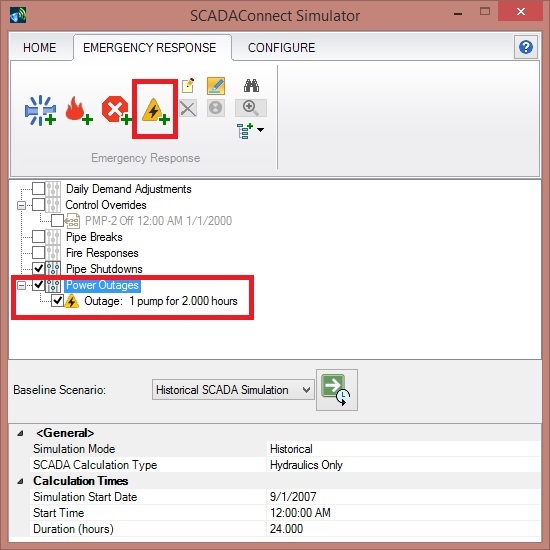 Power outage events enable the user to mark pumps or variable speed pumps as being affected by a power outage. As part of the SCADAConnect simulator tool, this provides a simple interface for an operator to simulate the impact of such an event.