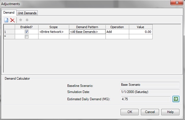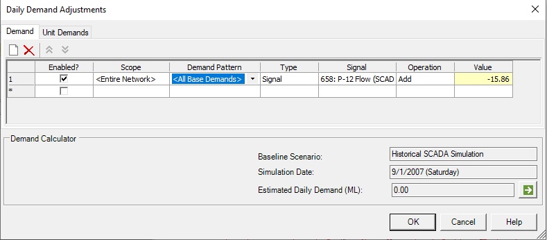 For demand adjustments, right-clicking on “Daily Demand Adjustments” in the middle of the SCADAConnect Simulator dialog will allow you to edit the demands or unit demands. You select the scope that you want to use, choose the demand pattern that you want to use, set the operation of the value set. In the lower right corner of this dialog you can use the compute button to estimate the total daily demand. When you create one of these, it appears in the tree form list beneath Demand Adjustment.