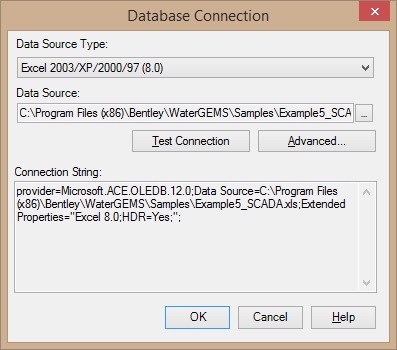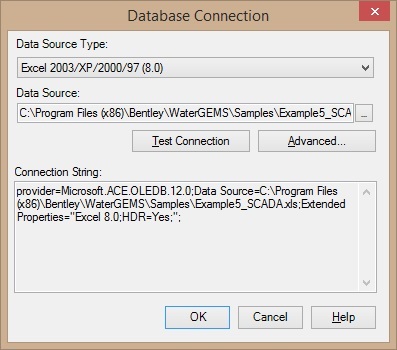 For Database Source connections, select New > Database Source. This will open Database Source dialog. Note: If you have a 64-bit machine with 32-bit Office, make sure that you are working in the 32-bit version of WaterGEMS if you are using Excel or Access files. You can find the 32-bit version of WaterGEMS here: C:\Program Files (x86)\Bentley\WaterGEMS\WaterGEMS.exe.