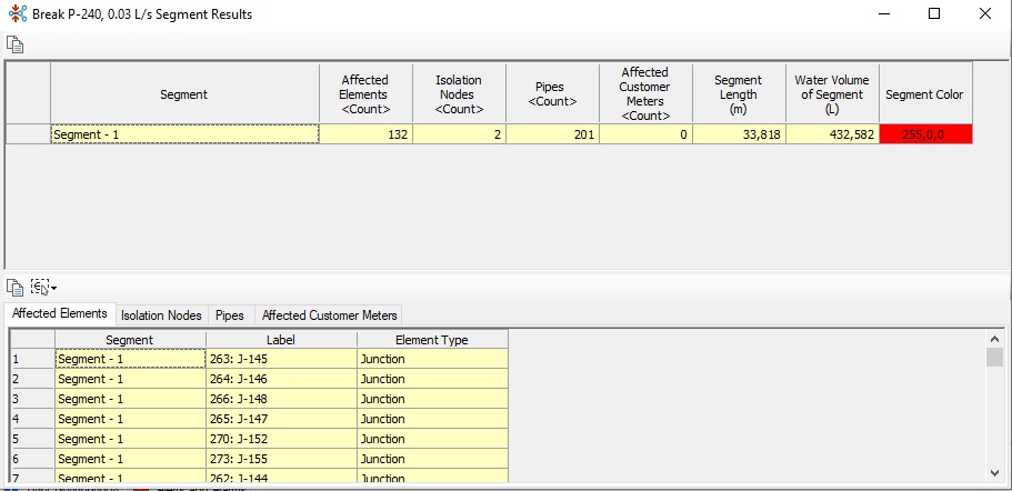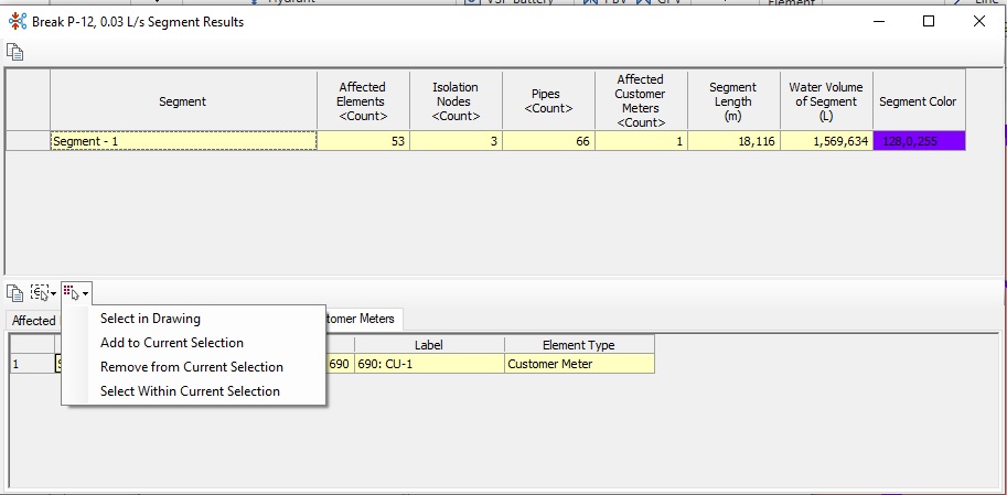 Note: Starting in the CONNECTION Edition Update 3 (version 10.03.01.08) release of WaterGEMS's SCADAConnect Simulator, there are improvements to the Pipe Shutdown Event. A Select Elements in Drawing button has been added so you can quickly view affected elements. To access these, right-click on a Pipe Shutdown event and choose Compute Event Outage. The outage segment for the pipe shutdown will be highlighted and a table will be generated with the affected elements.