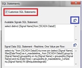This new feature will allow you to accommodate any SQL extensions that your database may support, opening potential support for other data historians such as GE Proficy. In order to enable customization, click the checkbox for the "Customize SQL Statements,” which will make the statement text boxes editable. If you make a mistake or want to reset the statements to the default you can click the "Reset to default" button that his highlighted by the blue box in the screen show below.