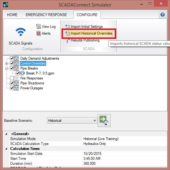 Starting with WaterGEMS CONNECT Edition, Control Override information can now be imported into SCADAConnect Simulator. In earlier versions of SCADAConnect Simulator, control overrides (cases where you may want to apply different controls than what is currently in the scenario) needed to be applied manually. With WaterGEMS CONNECT Edition, you can now import historical pump information to automatically create the controls in the model and apply the overrides. In SCADAConnect Simulator, select the Configure tab and choose Import Historical Overrides. Note: Starting with WaterGEMS CONNECT Edition Update 3 (build 10.03.00.69), you can now automatically import control overrides when using the Historical or Historical (Live Training) simulation modes. If there are control overrides that are outside of the Difference Tolerance value, the control overrides will be automatically imported. The user can opt to set this automation field to False and manually update the control overrides.