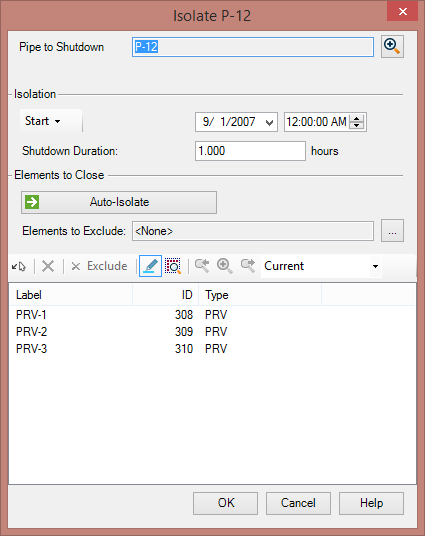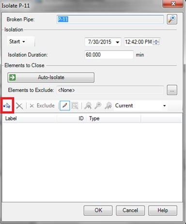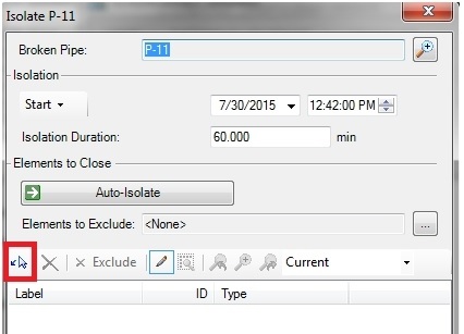 Click the Auto-Isolate button and the program will populate the valves needed to isolate the pipe. If there are no isolation valve or other valves in the model in that part of the system, the user can select pipe elements to close. It is up to the user to ensure that these pipes have sufficient valves to accomplish this isolation.