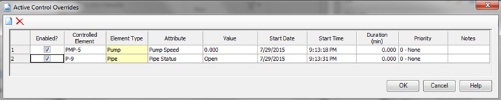 You can also override controls that might be present on elements in the model. For instance, there may be a control on a pump in the system where it turns off at a certain level. However, in your SCADA run, you would like to change that level to something else without changing the control in the baseline model. Another example would be a case where a valve is manually operated at a certain time and you need to account for that (and it is not already set as a logical control in the model based on logic)