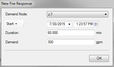 Fire Response enables the user to place a fire demand (or other emergency flows) at a junction for a period of time to determine its impact on pressure and flows and possibly test alternative ways of responding to the fire. Like Pipe Break, you can create a new Fire Response multiple ways. You can right-click on Fire Response in the tree form. From the Home tab, you can click the New button and then choose Fire Response. From the Emergency Response tab, you can choose Fire Response. Any other these options will generate a Select tool bar to allow you to choose a junction or hydrant. After selecting the node, the following dialog is displayed.