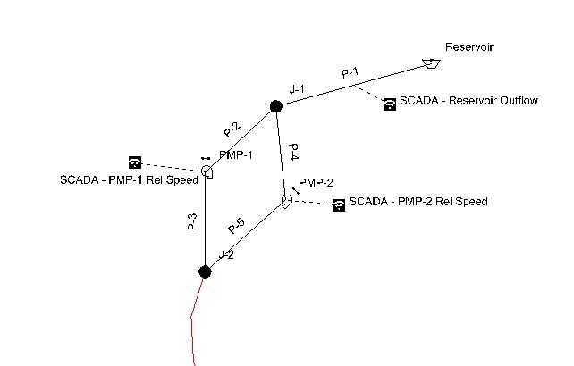 The SCADA data associated with this example is an Excel worksheet. That worksheet contains data for pipe flow in P-1 and relative speed factor data for the pumps. With that data available, SCADA elements were included for these three elements. (Note: there are also SCADA elements in this sample model associated with a tank, as well as a few other pipes in the system. The focus is on these elements for clarity.)