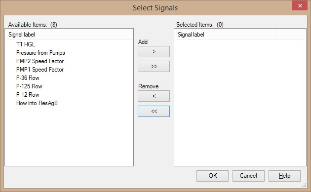 The available SCADA elements will be listed on the left side. Add the necessary signals by, double-clicking the label or clicking ">" or ">>" button. The ">>" will add all. Click OK button when finished. The Database Source will now be filled in.