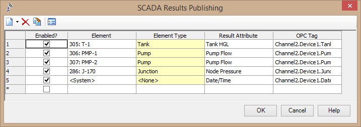 SCADA Results Publishing is a feature applicable to the OPC Source. This tool basically defines how things are mapped from the hydraulic model to the OPC. If results from an element are desired to display in an existing OPC then this tools comes into play. In order to push the result, the simulation must be run from SCADAConnect Simulator.