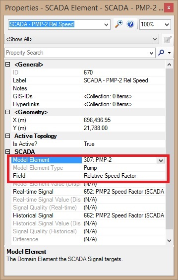 You will also need to assign the Field attribute. This denotes what element property field the SCADA Element represents. For a pump, this could be Flow or Relative Speed Factor. For a tank, this could be Level or Tank Status. For a pipe, this would be Status or Flow. You can set the Field attribute for the SCADA Element either in the properties grid or by opening the SCADA FlexTable and setting the Field attribute there. The SCADA Element FlexTable can be accessed in SCADAConnect Simulator from the Home tab and choosing SCADA Elements. It can also be reach from the main user interface through View > FlexTables. Below is the property grid for a SCADA element associated with a pump, and representing the pump’s relative speed factor.