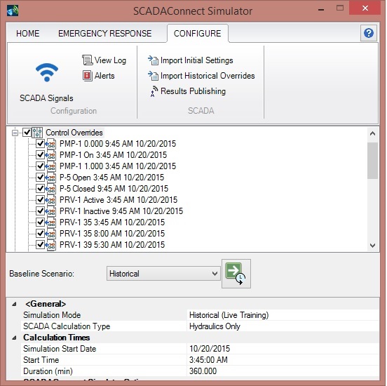 In version 08.11.06.113 of WaterGEMS, the SCADAConnect Simulator feature was introduced, with a major new user interface. In version 10.00.00.XX, additional features were added, such as power outages, pipe shutdowns, and the ability to import control overrides.