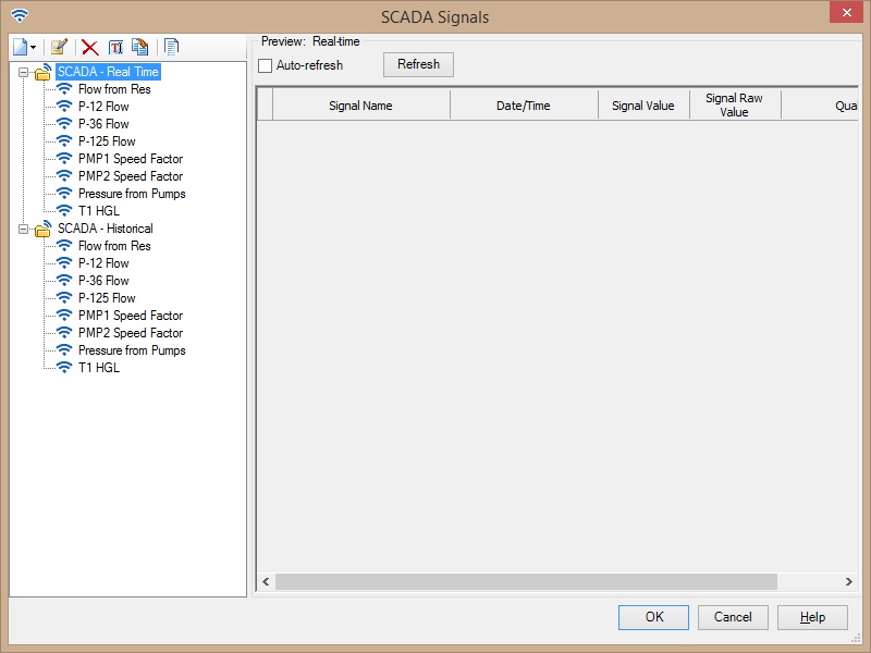 SCADA Signals window will now list the signals in the left panel as a tree structure. Clicking on the signal on the left will show the corresponding data. Make sure to click either on Refresh or Auto Refresh to see the data. The screenshot below shows the data from the Excel source file for the SCADA element associated with pipe P-1 in the earlier screenshot.