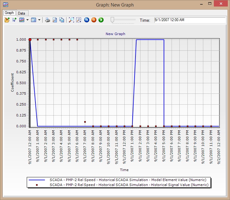 The SCADA data can be used to help calibrate a model by comparing data from the SCADA system with model results. There are several ways to do this. Comparing graphs is one way. In SCADAConnnect Simulator, there is a Graphs button. Clicking this will open the Graphs manager. Choose the New button, then Line-Series Graph. The Select toolbar will open. Choose the SCADA Element you want to graph. The line data will be the model results; the points will be the SCADA values from your data source.