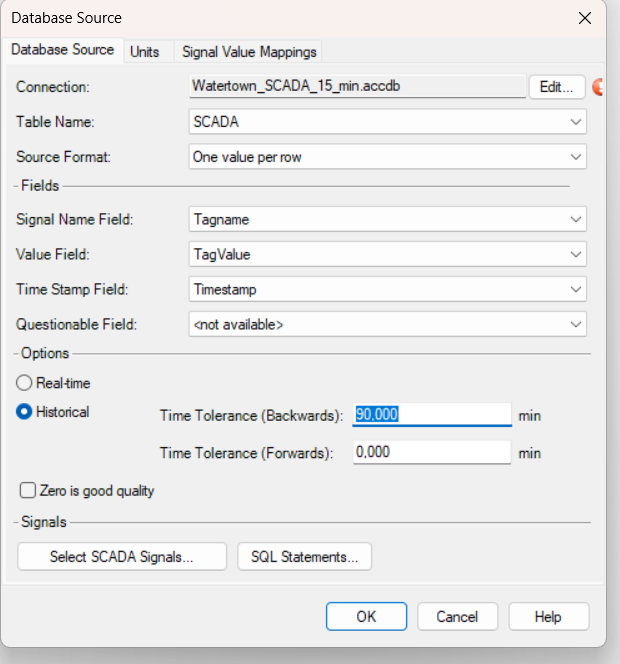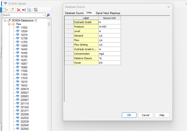 Below an example of the SCADA signals name/tags and units in WaterGEMS (that need to match those defined in the sensor administration page of WaterSight)
