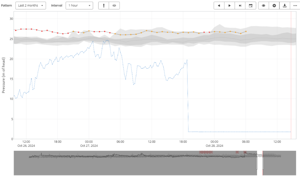 Fig 1 - Model value at blue does not match sensor measurements (black line) for the PRV boundary element due to mismatch of units defined in the hydraulic model and in the sensor configuration template