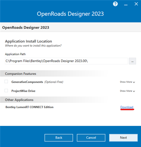 With OpenRoads 2023 version you have to manually download LumenRT from our official download website