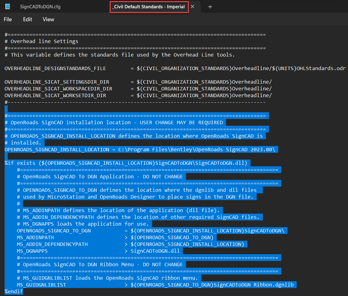 Copy the contents of the SignCADToDGN.cfg and paste them into the _Civil Default Standards - Imperial.cfg or other WorkSpace .cfg file located under the OpenRoads Designer Organization-Civil folder.