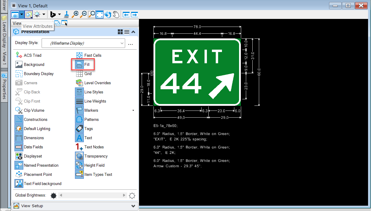 IMPORTANT: If you have the Fill Color (2023 SignCAD To DGN) or Import Background Color (2025/2024 SignCAD To DGN dialog) boxes checked in the Import or Paste dialogs and the placed signs do not display with the color fill, then check the View Attributes in OpenRoads Designer or MicroStation to make sure that Fill is toggled ON.