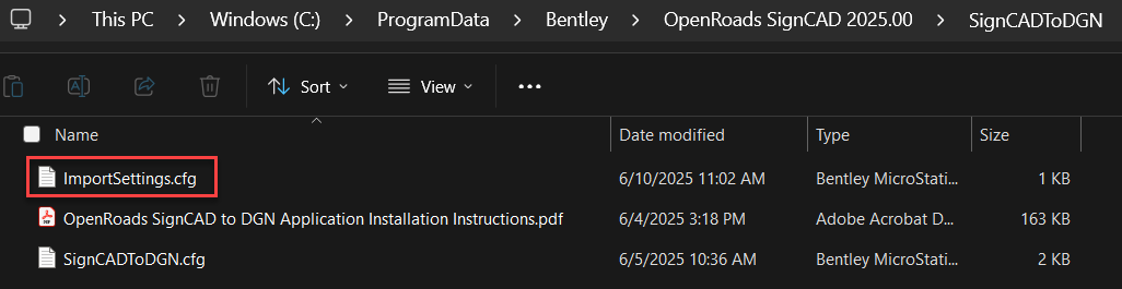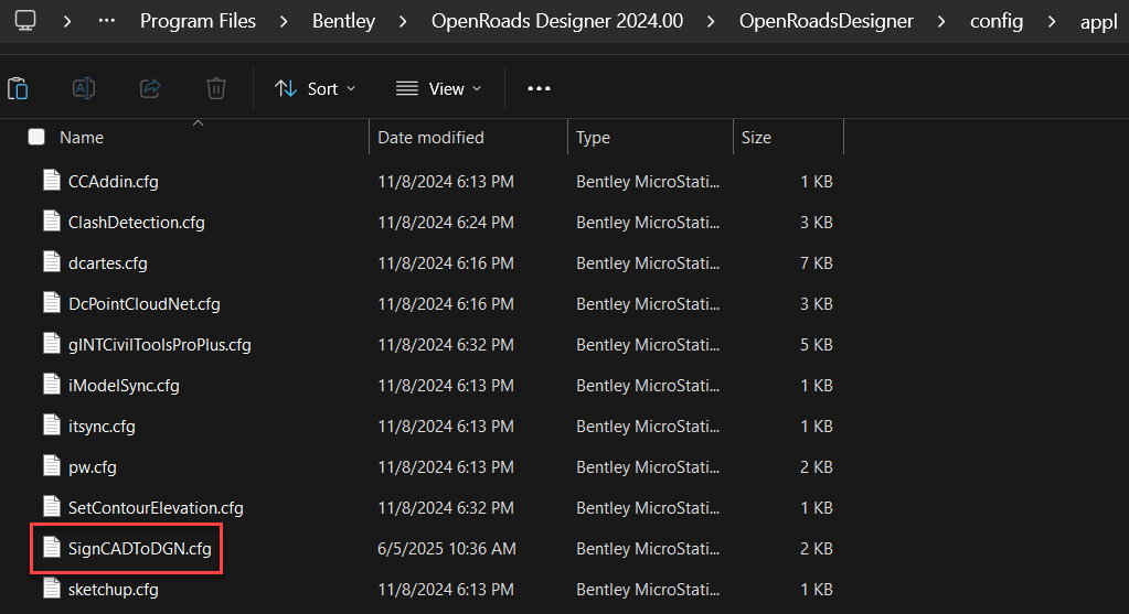 Copy the SignCADToDGN.cfg file found in the C:\ProgramData\Bentley\OpenRoads SignCAD 2024.00\SignCADToDGN folder and paste it into the MicroStation, OpenRoads Designer, OpenRail Designer, or OpenSite Designer product config\appl folder.