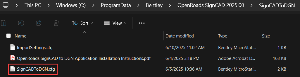 Copy the SignCADToDGN.cfg file found in the C:\ProgramData\Bentley\OpenRoads SignCAD 2023.00\SignCADToDGN folder and paste it into the MicroStation, OpenRoads Designer, OpenRail Designer, or OpenSite Designer product config\appl folder.