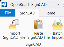 The OpenRoads SignCAD ribbon workflow includes icons to Import SignCAD File or Paste SignCAD File into the DGN file. The OpenRoads SignCAD 2025 version has a new Batch Import option.