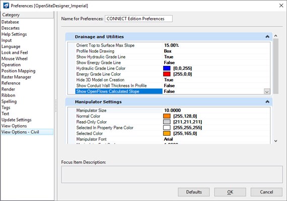 - Fixed several issues with manipulators for nodes and conduits in a profile model. Note that the Set Invert to Start / Stop properties on a conduit, if set to True, will cause the related invert manipulator to be read-only. Also, the File > Settings > User > Preferences > View Options – Civil > dialog now includes an option to “Show OpenFlows Calculated Slope, in the Drainage and Utilities category. This will cause the conduit slope manipulator to use the OpenFlows slope, which is measured using the center to center length of the conduit, instead of the exact (i.e. clipped) length. Note that the OpenFlows slope is a read-only value.