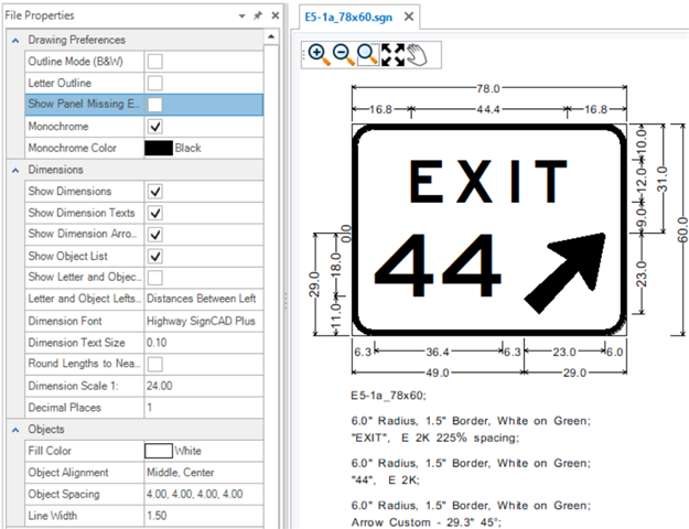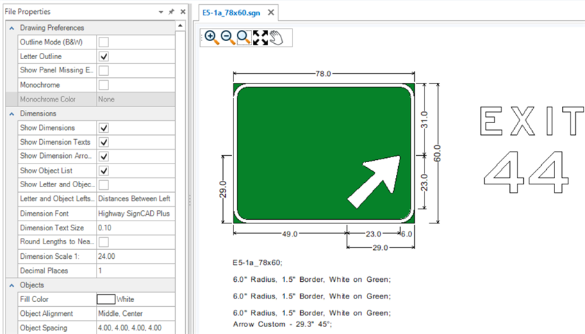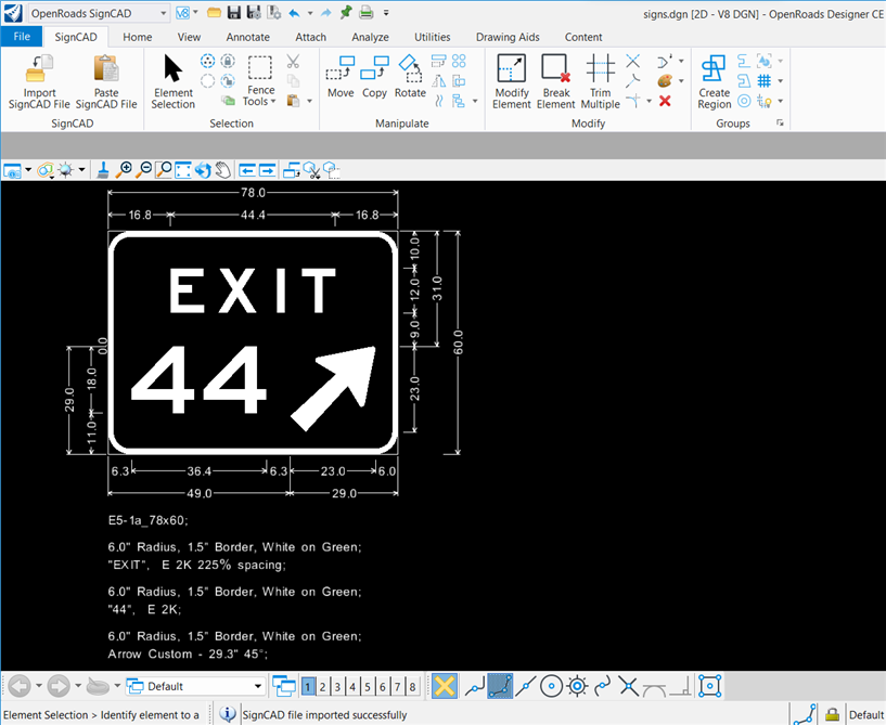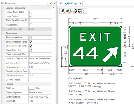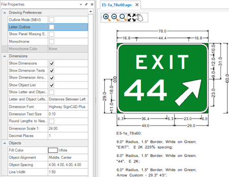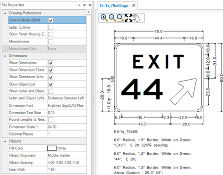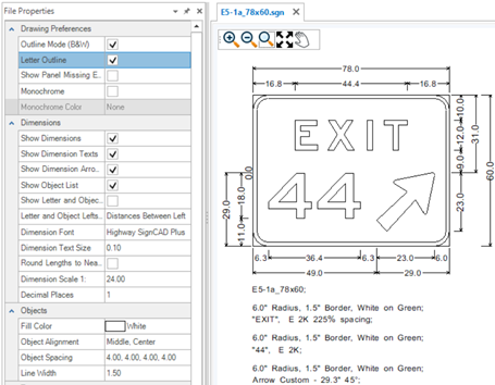 Tip: Use Letter Outline, Monochrome and Monochrome Color: White to bring signs over into OpenRoads Designer and MicroStation using the SignCAD to DGN application if you want the sign to have white fill on the border and elements.