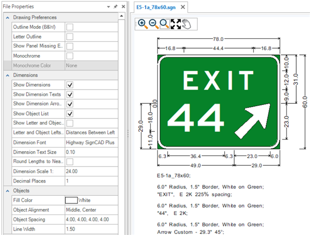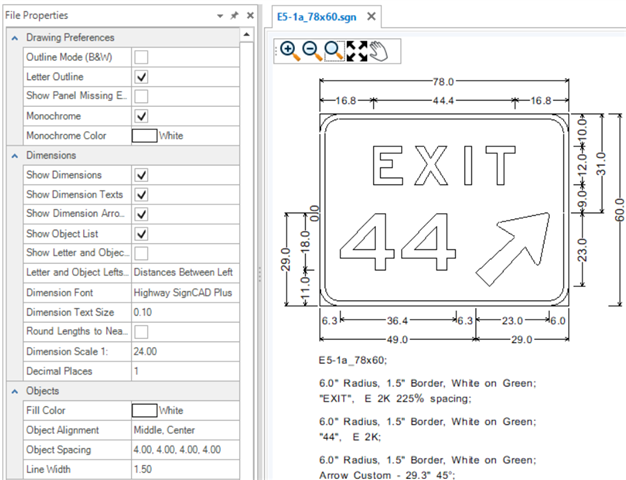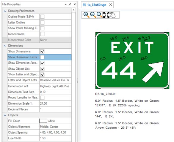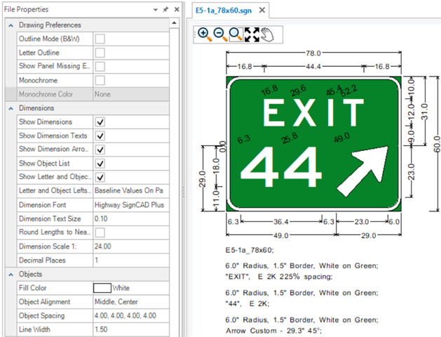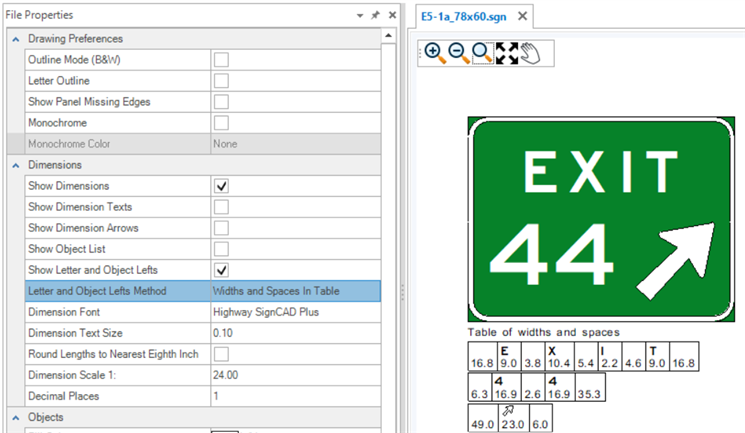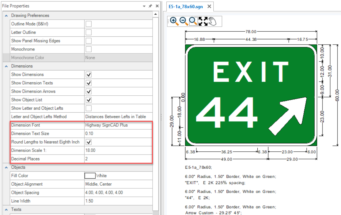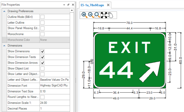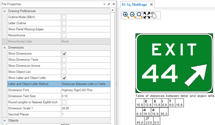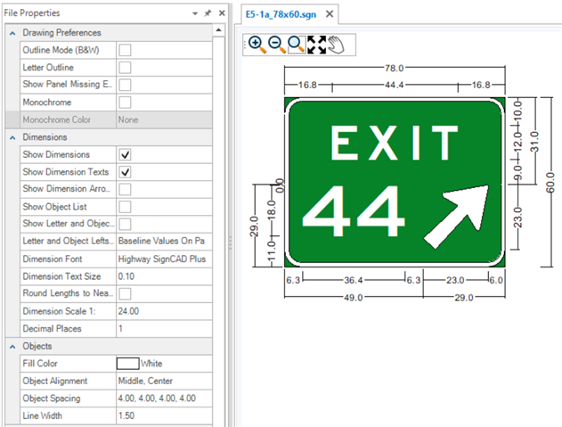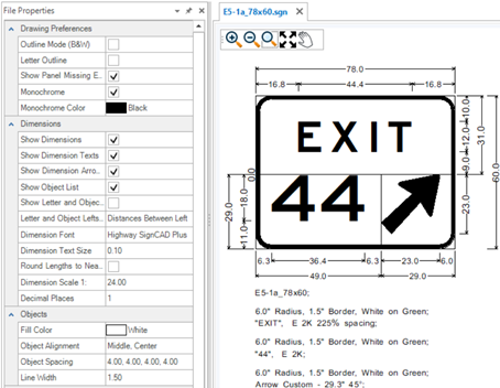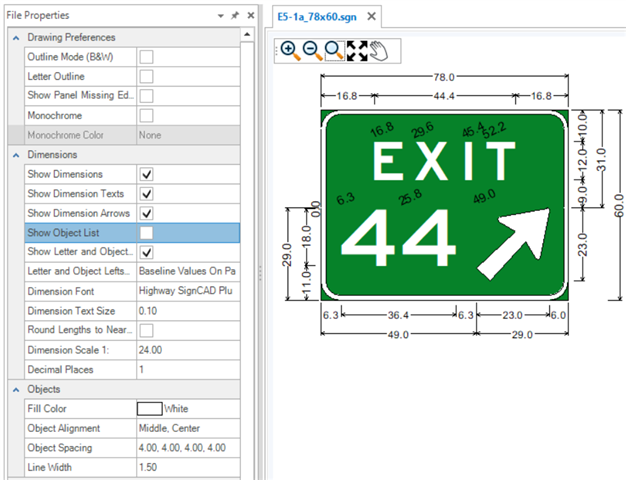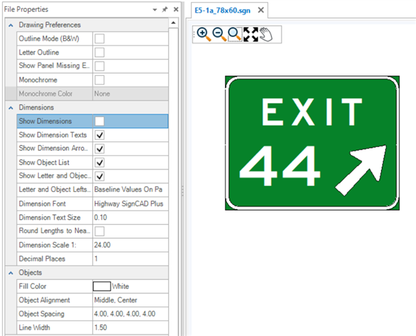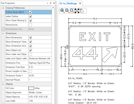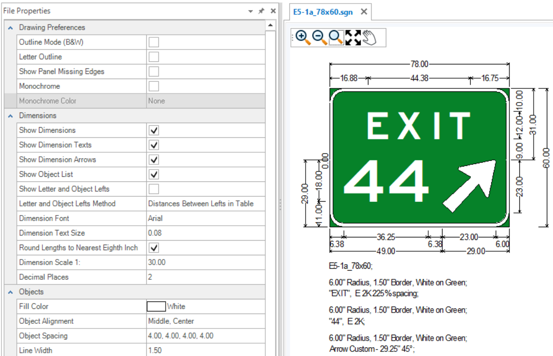 The Properties tool is used to view and edit properties of existing elements. If no element is selected, the File Properties of the active SGN are shown. The File Properties are grouped by Drawing Preferences, Dimensions, Objects and Texts. These groups are expandable and collapsible. The File Properties for new files come from the User and Application Settings. Existing sign files will have their own File Properties which may be different from those set in the Backstage. To change sign file settings after a file is created, use the File Properties.
