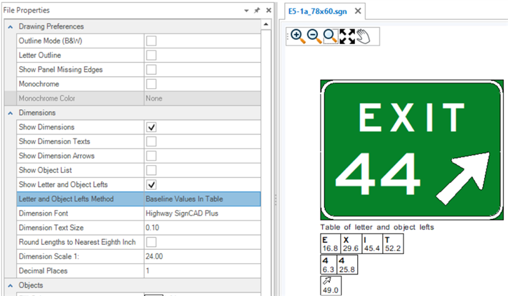 Step 10: Under Dimensions, select Show Dimensions and Show Letter and Object Lefts. The Show Letter and Object Lefts determines how the dimensions are displayed in the table below the sign or on the panel. Unchecking Show Letter and Object Lefts removes that information from displaying on or below the sign. Select each Letter and Object Lefts Method from the drop-down menu to see the information shown. The four methods include: