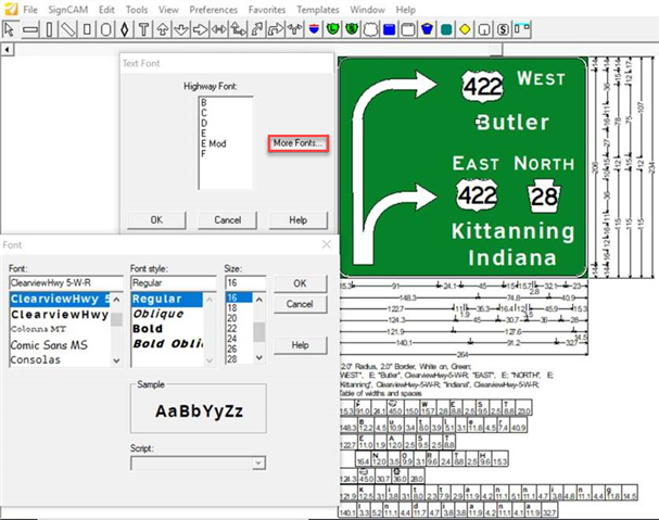 Additional TrueType fonts can be used in OpenRoads SignCAD by selecting the More Fonts button found in the Text Font dialog box. The Font dialog box will list the available TrueType fonts installed in the C:\Windows\Fonts folder on the computer that can be selected and used in OpenRoads SignCAD. Select the desired font, style and size and press OK.