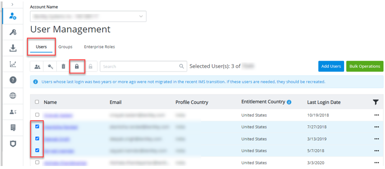 1. On the User Management screen, click Users tab, select user(s) and click Lock User(s) icon on the screen above user list to disable login for the selected user(s).